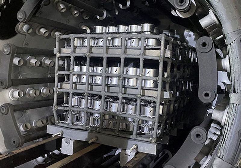 加熱室(爐膽)由隔熱層、加熱元件、石墨噴管和料臺等組成。隔熱層為三層石墨軟氈(20mm)和一層石墨硬氈(30mm)組成的圓形結構。其結構保溫性能好,硬氈特點:在氣淬時不會被強風吹掉保溫層,大大的提高了加熱室的使用壽命。隔熱層被固定在由不銹鋼板網和角鋼圈組成的加室框架上;前、后蓋裝有固定風門,風門邊上包有CFC材料防止氣流沖刷。 加熱元件采用石墨管,用陶瓷件絕緣。加熱元件沿隔熱層內壁圓周方向均勻布置,加熱均勻、熱損失小;可單獨拆卸,且更換方便。石墨噴管為多列石墨噴管,均勻的沿隔熱層內壁圓周方向分布在加熱室里。在氣淬時強制氣體均勻的從石墨噴管噴出,有效的達到均勻淬火。料臺由石墨支柱、石墨爐床和爐床上的Si2O3隔條組成。此結構可防止高溫時料盤和石墨爐床的粘結。加熱溫區分為1區。1溫區獨立加熱,1溫區獨立控溫。整個圓形加熱室沿爐體長度方向劃分為一個環形單元。絕緣子采用高純氧化鋁絕緣瓷件,具備高溫絕緣。